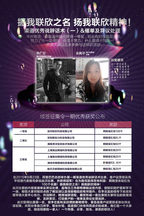 在2015年8月23日,阿里巴巴總部舉辦第一期渠道優秀說辭話術比賽,客戶運營部吳鳳平經理代表我司參加此次比賽,并獲得冠軍!也為我司...