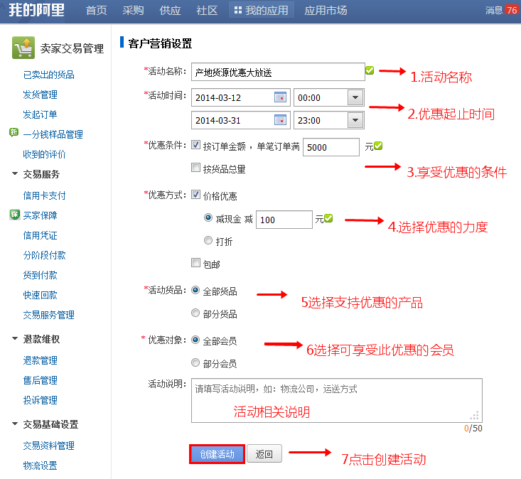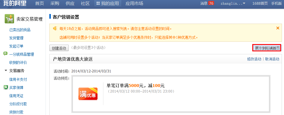 1)設置入口:路徑:“我的阿里”首頁—— “賣家交易管理”——營銷設置-“滿優惠設置”——設置好相關時間、條件及說明后點擊保存——點擊“將活動展示到旺鋪”——保存完成!